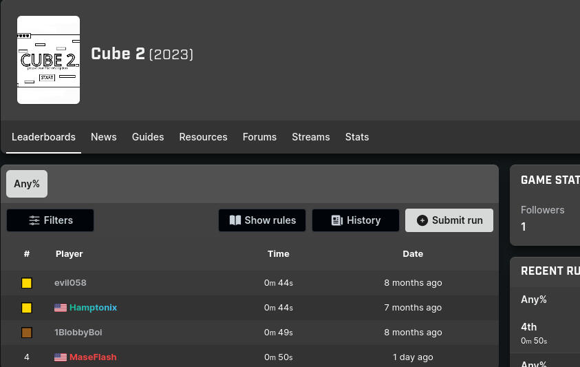 Many people like to Speedrun Cube 2, if you would like to submit your runs you can visit our page.